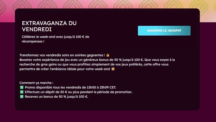 Let's Jackpot Casino se renomme par plusieurs caractéristiques positives qui captivent les fans de jeux. Tout d'abord, sa diversité de jeux est un véritable avantage. Les joueurs peuvent se divertir de machines à sous, de jeux de table classiques et de jeux en direct, offrant ainsi une expérience variée et stimulante. De plus, l'UX est conviviale, ce qui facilite la circulation et optimise l'expérience en ligne des utilisateurs.